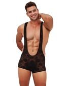 Advantage Selling Points:1. Main fabric is lace mesh, sheer and sexy;2. Front U-shaped pouch design, sexy and comfortable;3. Suspenders-style romper shorts, classic and unrestrictive.Standard Product Name: Black, lace mesh, front U-shaped pouch design, S-2XL, men`s sexy bodysuit.Main Keywords: lace mesh, front U-shaped pouch design, suspenders-style.