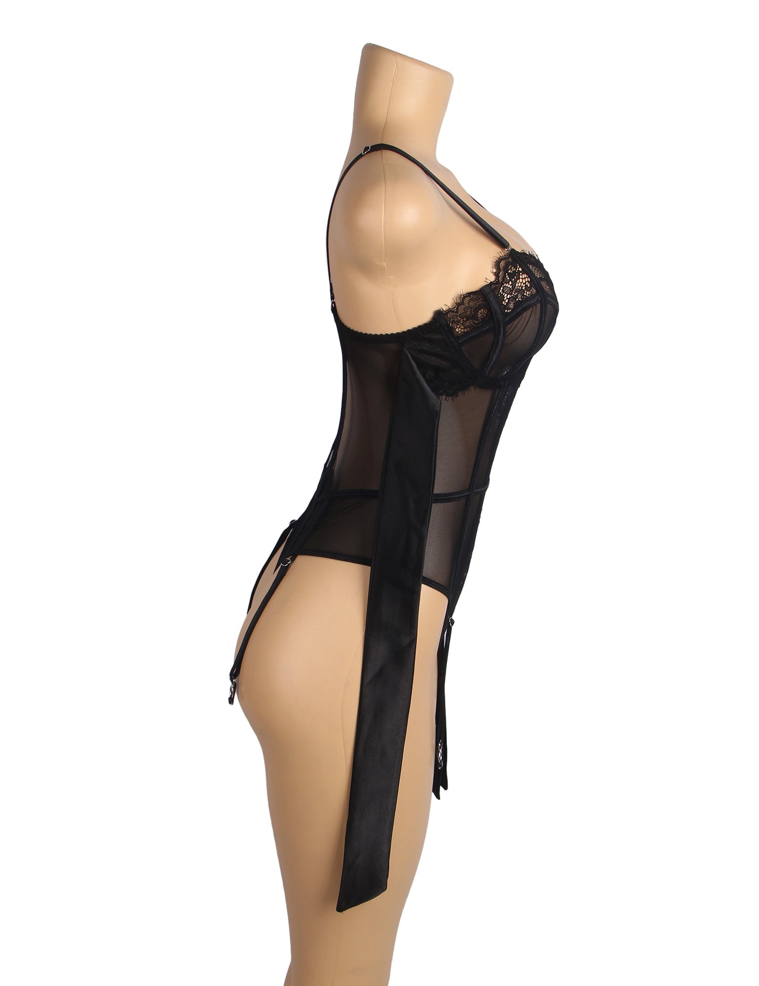 Advantage Selling Points1. Main fabric lace mesh, sheer and sexy; 2. Sides of the chest feature ribbon bow ties, adding a binding playful element; 3. Underwire in the chest, back buckle design, adjustable bust; 4. Chest features eyelash lace stitching + small details of hollow back, hot and sexy; 5. Crotch has an open buckle design for easy wear; 6. Four elastic garter straps to prevent slipping, stylish and elegant; 7. Stainless steel metal fittings, high quality and durable; Standard Product Name: Available in black and red, lace mesh fabric, chest sides feature ribbon bow ties, underwire, back buckle design, adjustable bust, adjustable straps, chest with eyelash lace stitching + hollow back details, crotch with open buckle design, four elastic garter straps, sizes M-3XL, sexy garter bodysuit; Main Keywords: lace mesh, ribbon bow ties, underwire, buckle, eyelash lace, hollow, buckle, garter straps.