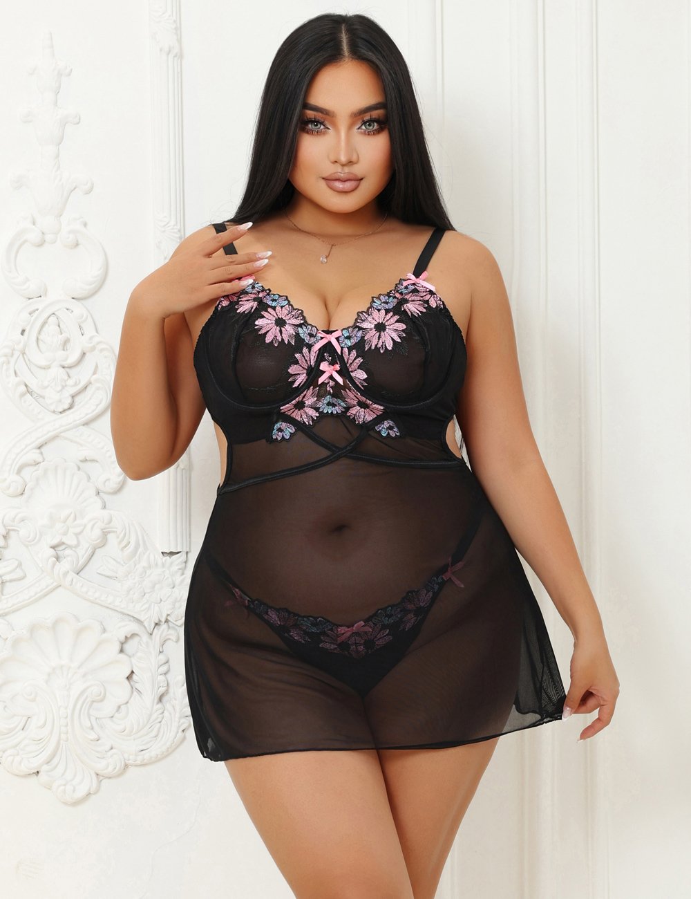 Standard Product Name:Black, light mesh, floral embroidery, chest lining, with steel ring, back buckle design, adjustable bust, adjustable straps, many embellished bows, to the side + back hollowed out small details, with T trousers, cotton gear, S-2XL size, women’s sexy slingback nightgownsMain keywords:mesh,floral embroidery,with steel ring,row of buttons,bow,hollow outAdvantageous selling point?1. The main fabric is lightweight mesh, soft and breathable;