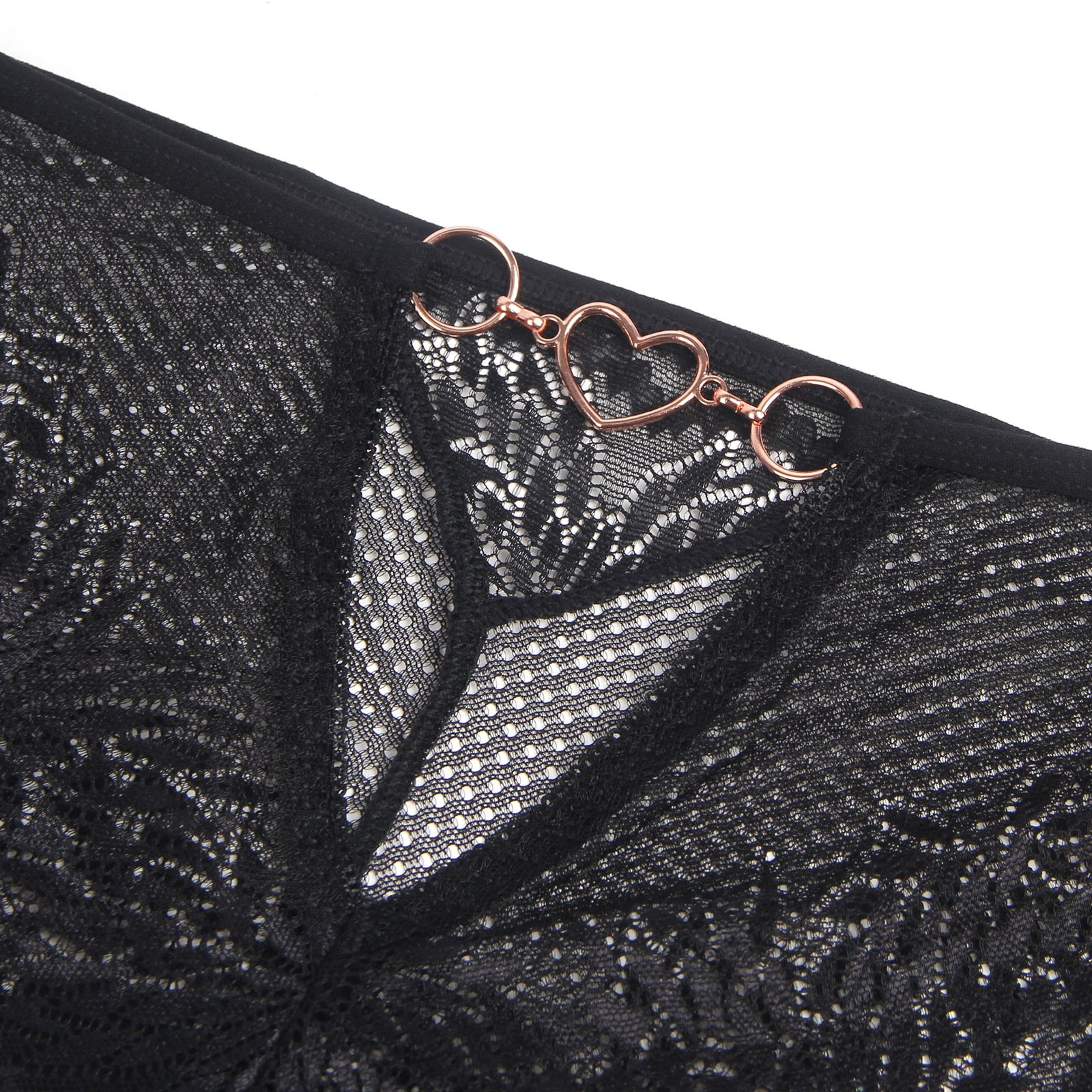 Advantages and selling points:1. Lace material, breathable and sexy;2. Hollow butt design, spliced heart-shaped metal decorative buckle, unique and fashionable;3. Equipped with cotton lining, comfortable to wear, breathable and sweat-absorbing.Standard product name: Available in black, red, and green colors; lace, hollow butt design, spliced heart-shaped metal decorative buckle, cotton lining; sizes M-3XL; ladies` sexy lace underwear.Main keywords: lace, hollow, heart-shaped decorative buckle, cotton lining.