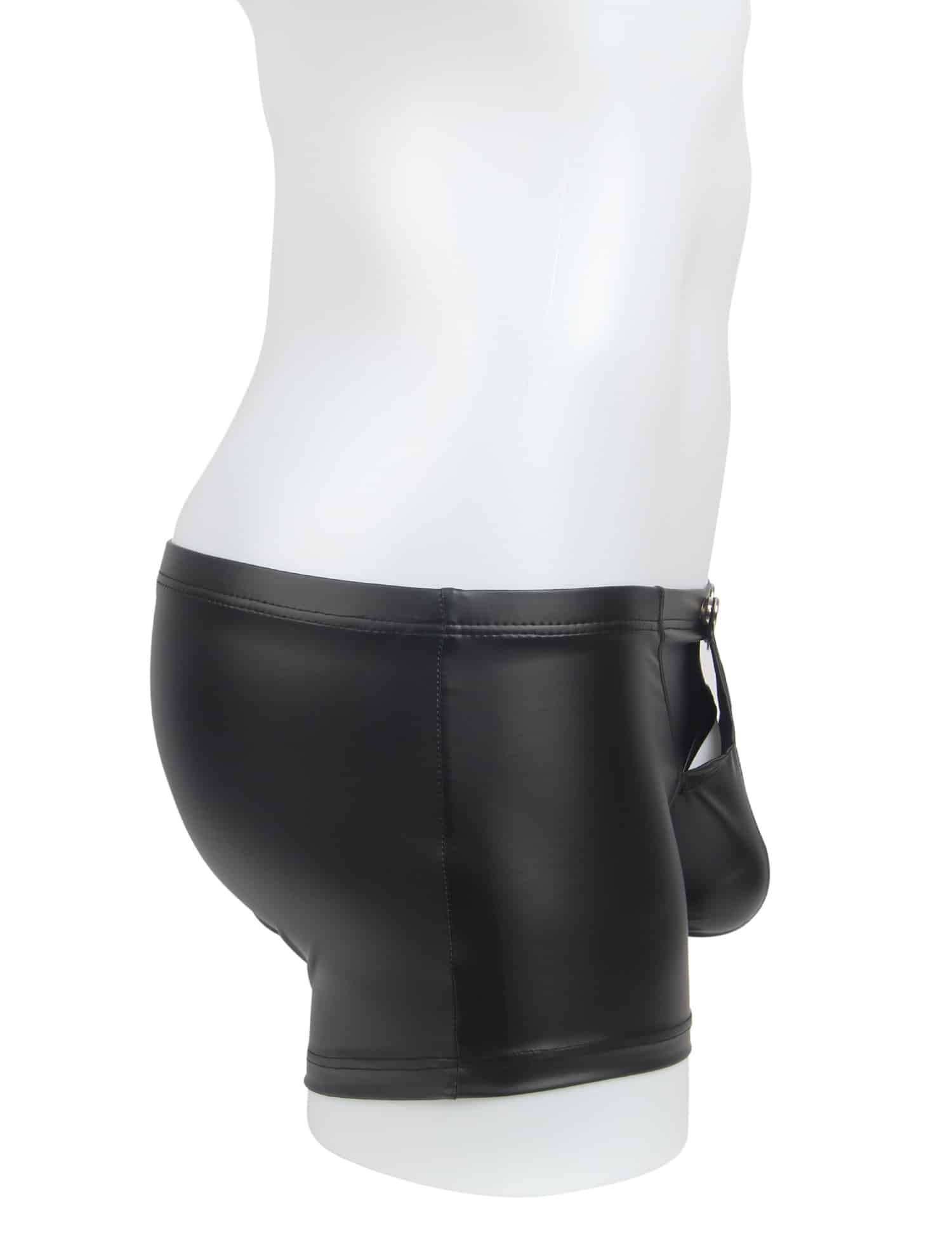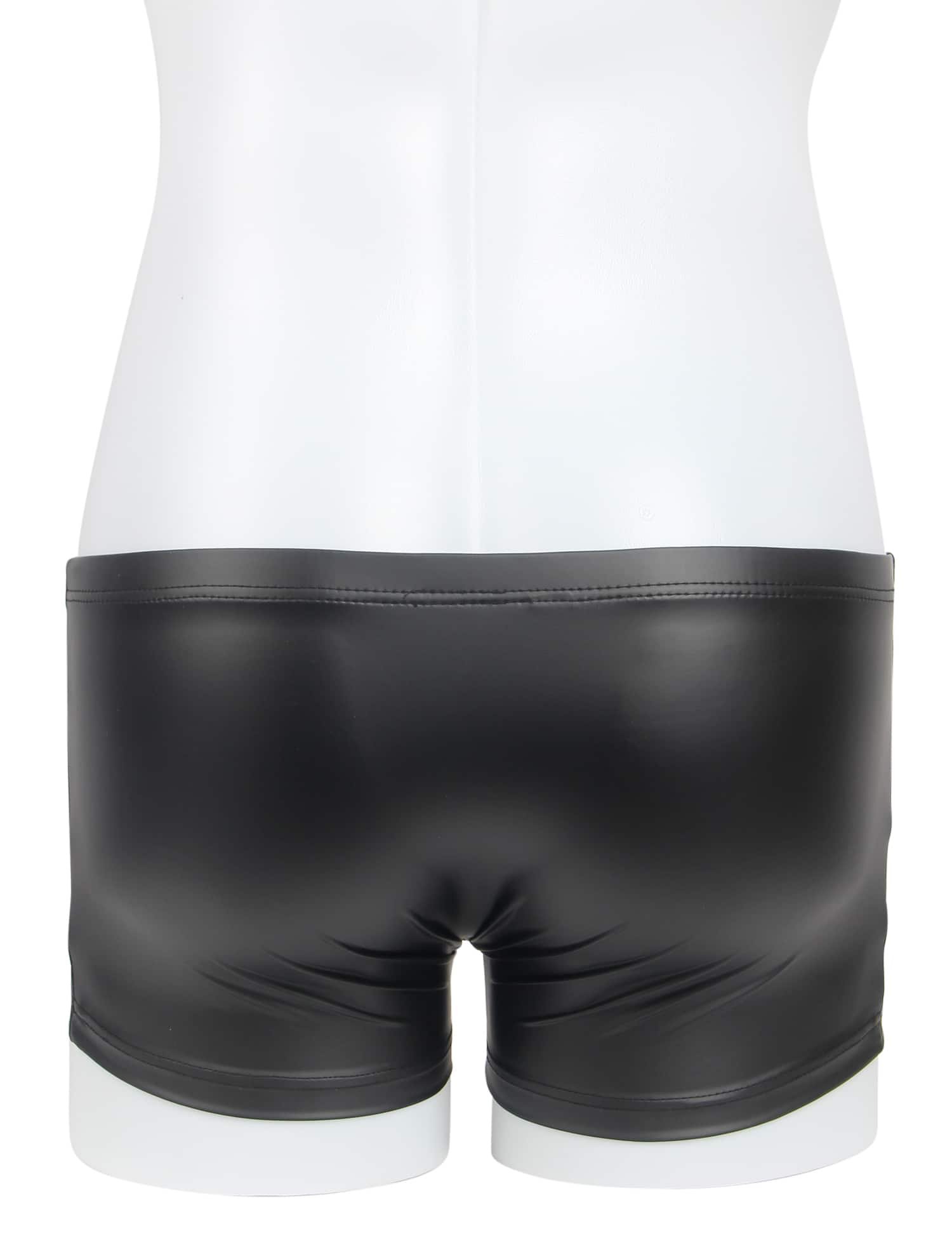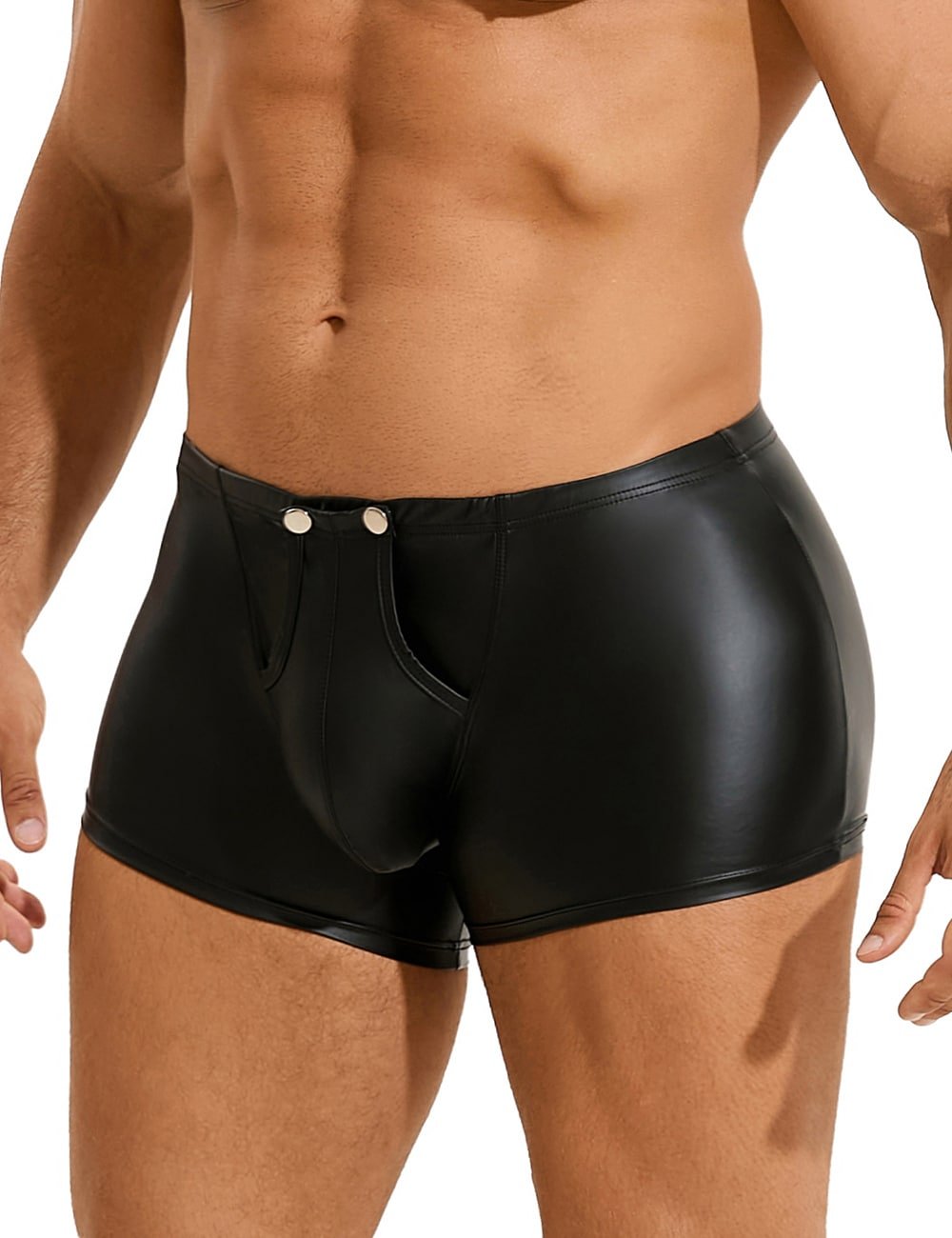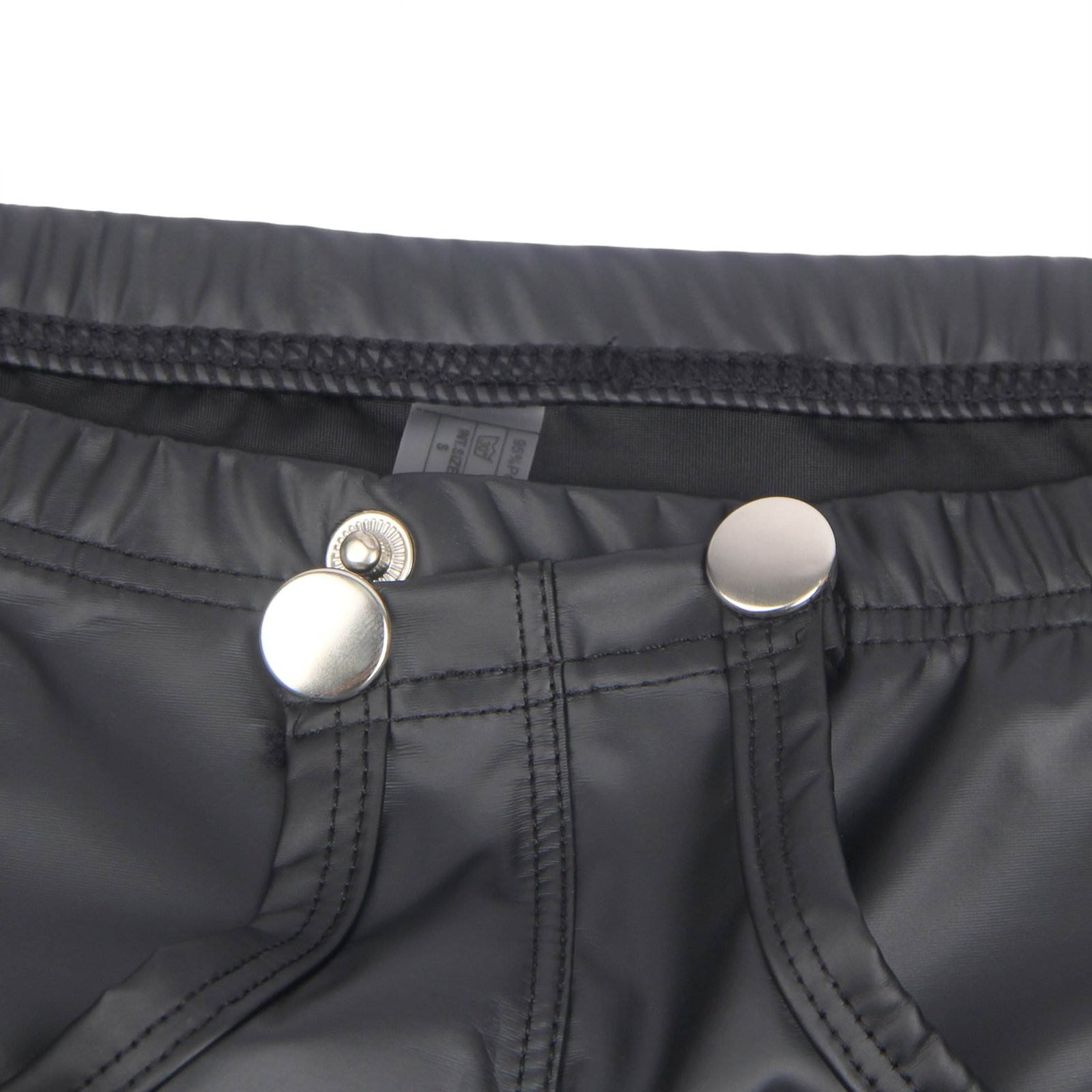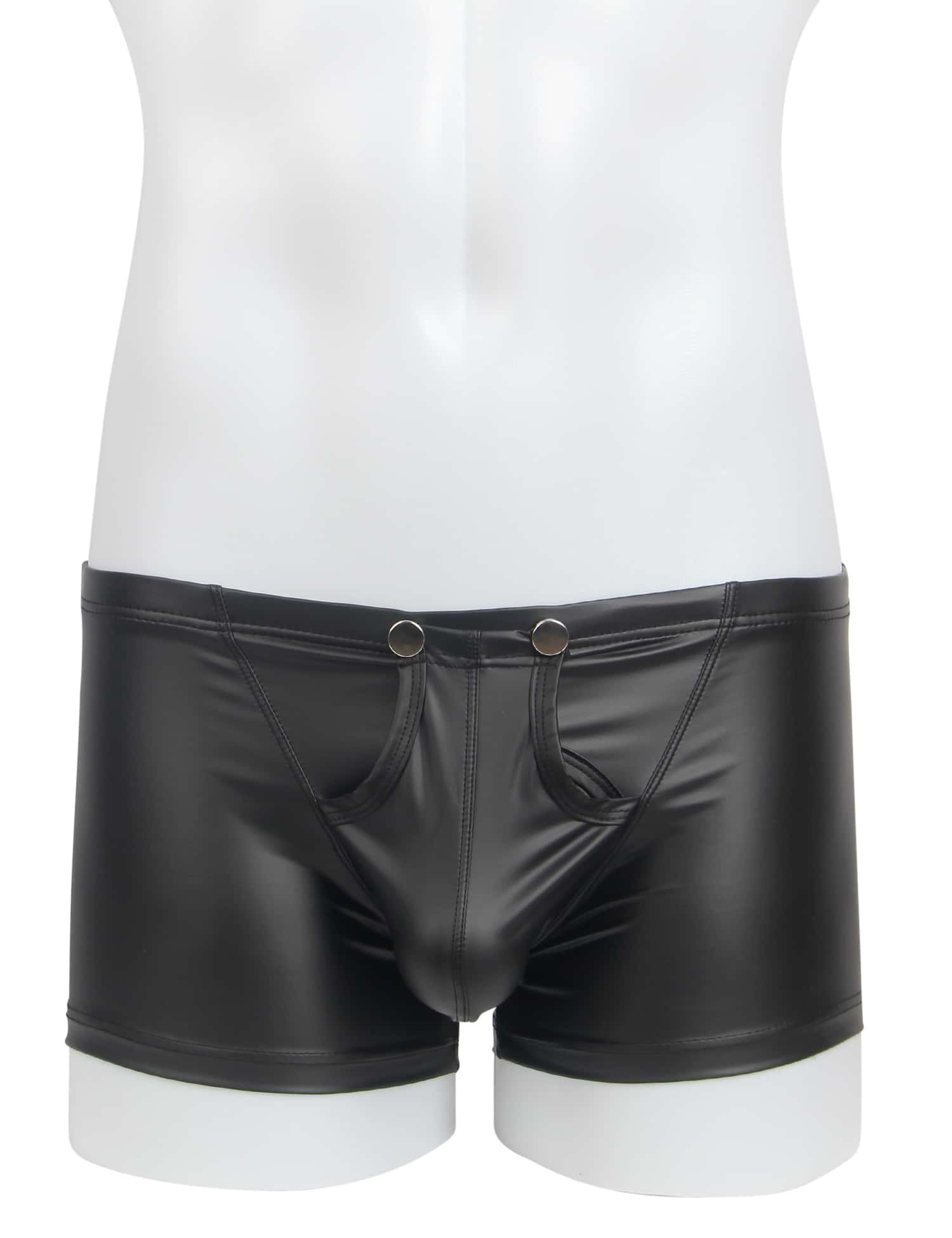 Advantages and Selling Points:1. Main fabric is PU leather, stylish and sexy; 2. Snap design at the crotch for convenience and uniqueness; 3. Boxer style, simple and elegant; 4. Central U-shaped pouch design, sexy and comfortable;Standard product name: Black, PU leather, snap design at the crotch, boxer style, central U-shaped pouch design, M-2XL, men`s sexy PU leather underwear;Main selling keywords: PU leather, snap, boxer.