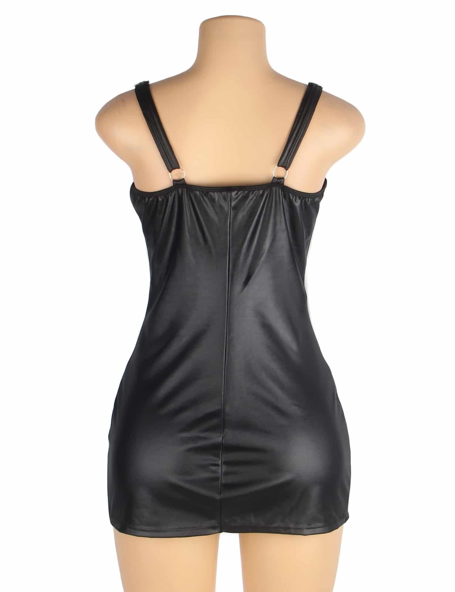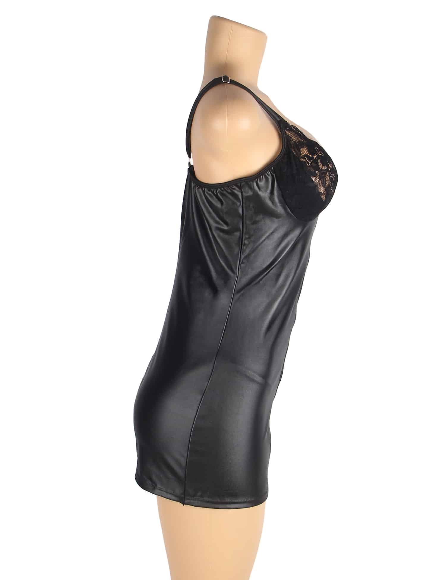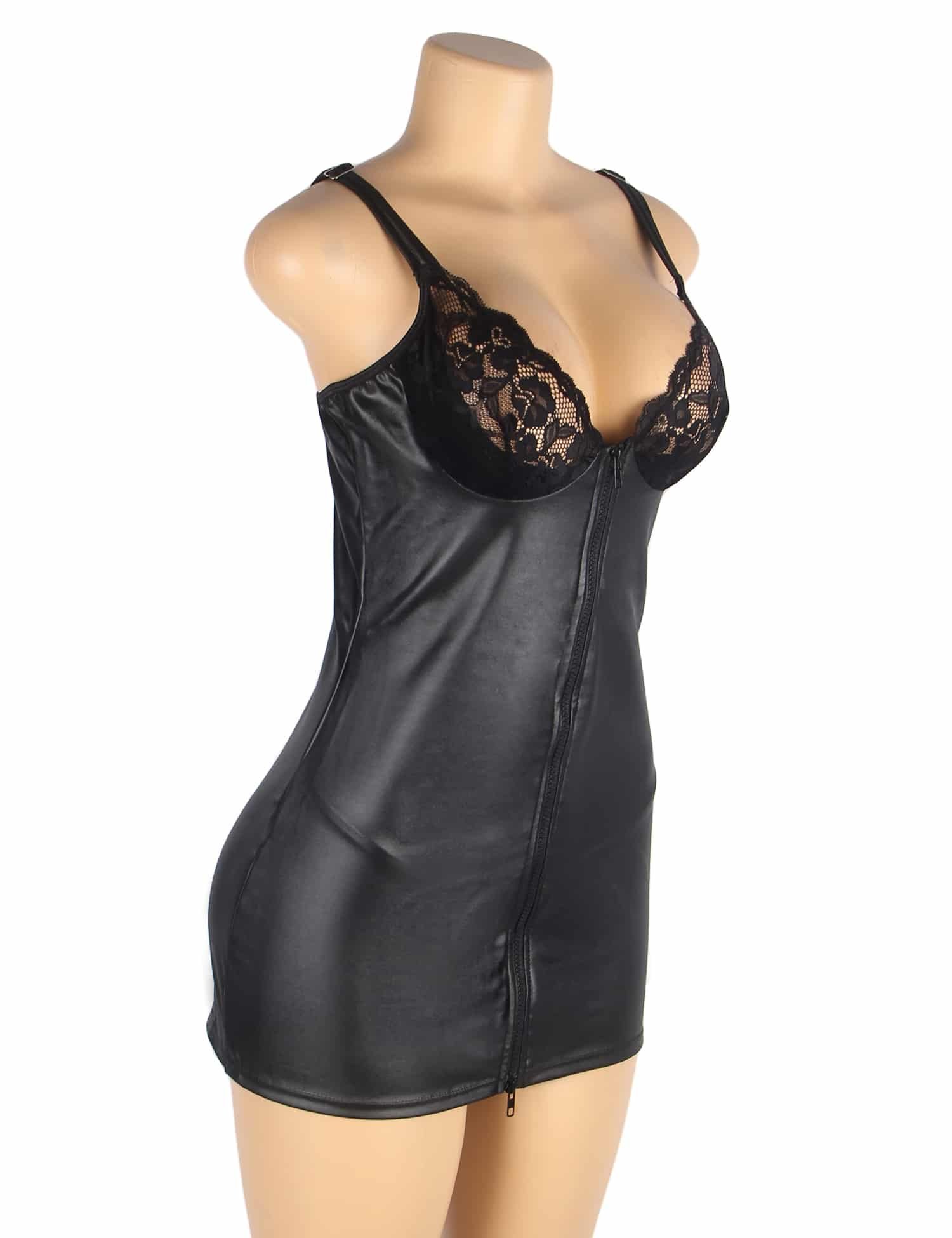 The old model has been upgraded to R81333: the gloss leather has been changed to PU leather, the underwear has been removed, and the size coding has been changed to continuous sizes.Advantages and selling points:1. Faux leather fabric with lace splicing at the chest, fashionable and sexy;2. Center front zipper design for easy dressing and undressing;3. Wide adjustable straps, comfortable and non-restrictive;4. Fitted bodycon mini dress, fiery and tempting.Standard product description: black, faux leather fabric, lace splicing at the chest, center front zipper design, wide adjustable straps, includes thong, sizes M-5XL, sexy fitted bodycon mini dress.Main selling keywords: faux leather, lace, zipper, wide straps, fitted, bodycon.