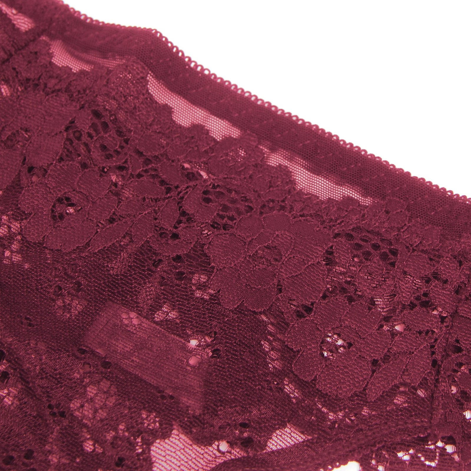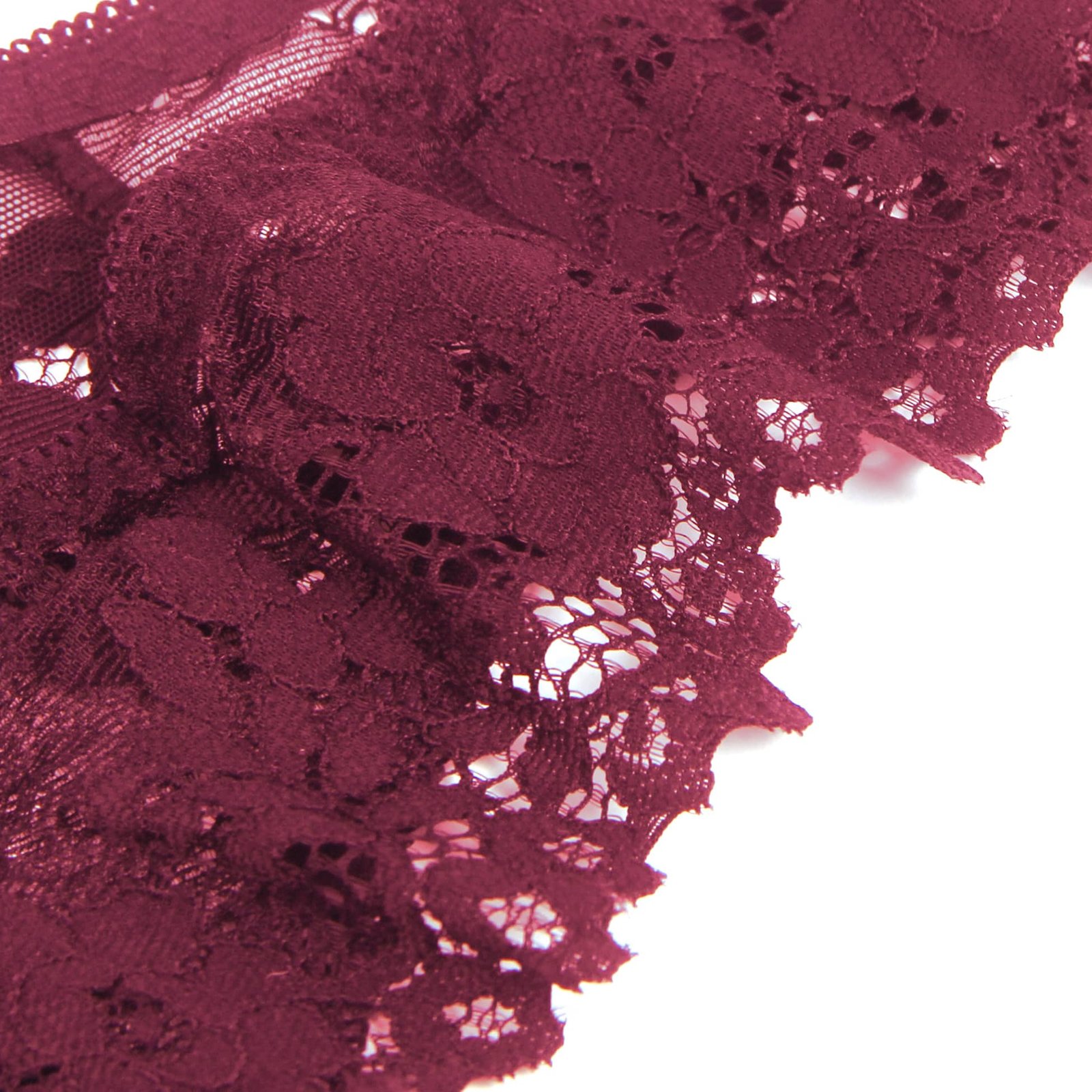Advantages and Selling Points:1. Waistband with elastic to prevent slipping;2. Lace trim design at the front center and leg openings, exquisite and high-end;3. Cotton gusset, breathable and sweat-absorbent.Standard product names: Available in black, white, skin, and burgundy, with lace trim and cotton gusset, sizes M-3XL, fashionable ladies` panties.Main keywords: lace trim, cotton gusset.