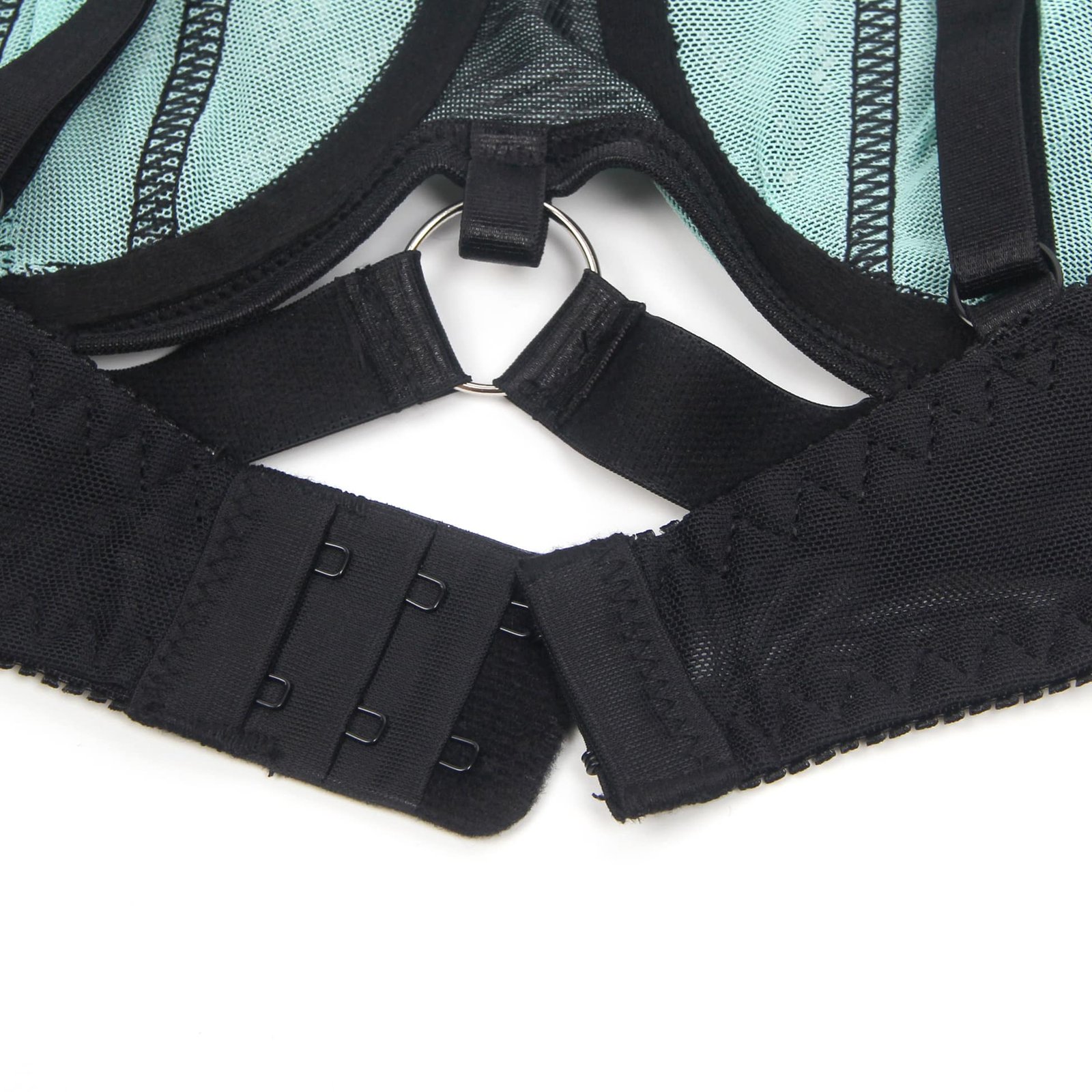 Advantages and selling points:1. The main fabric is lightweight mesh, soft and breathable; 2. Chest lining with underwire, back hook-and-eye design, adjustable bust circumference, lifts and supports; 3. Front chest and panties feature lace trim, beautiful and exquisite; 4. Metal clasp connection at the front chest, adorned with sparkling rhinestones, uniquely personal; 5. High-waisted style with a widened elastic band at the waist, strong elasticity; Standard product name: Available in pink and green, mesh, chest lining, underwire, back hook-and-eye design, adjustable bust circumference, adjustable straps, front chest and panty lace trim, metal clasp, adorned with rhinestones, widened elastic band at the waist, cotton crotch, M-3XL, sexy lingerie two-piece set; Main keywords: mesh, underwire, hook-and-eye, lace trim, metal clasp, rhinestones, elastic band, cotton crotch.