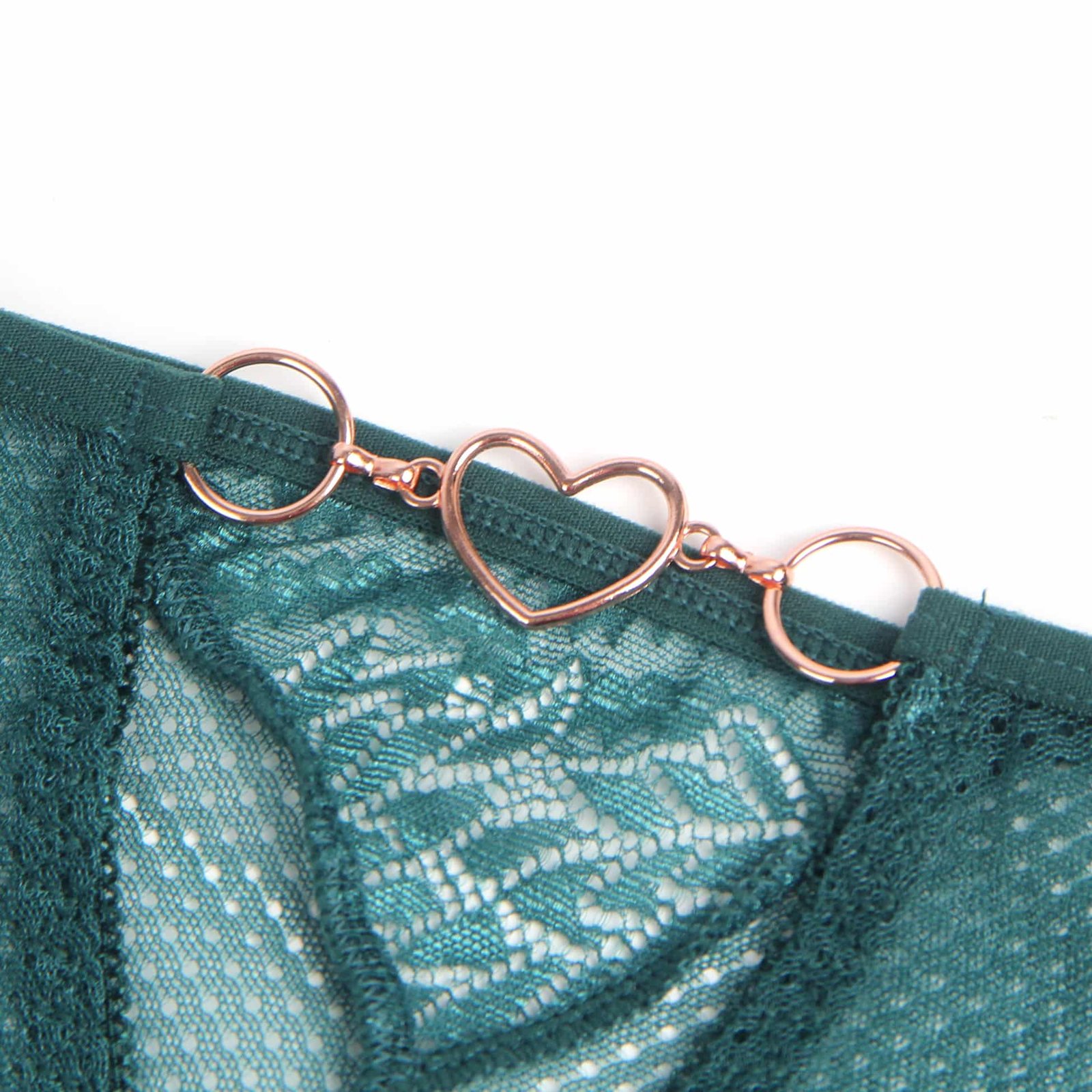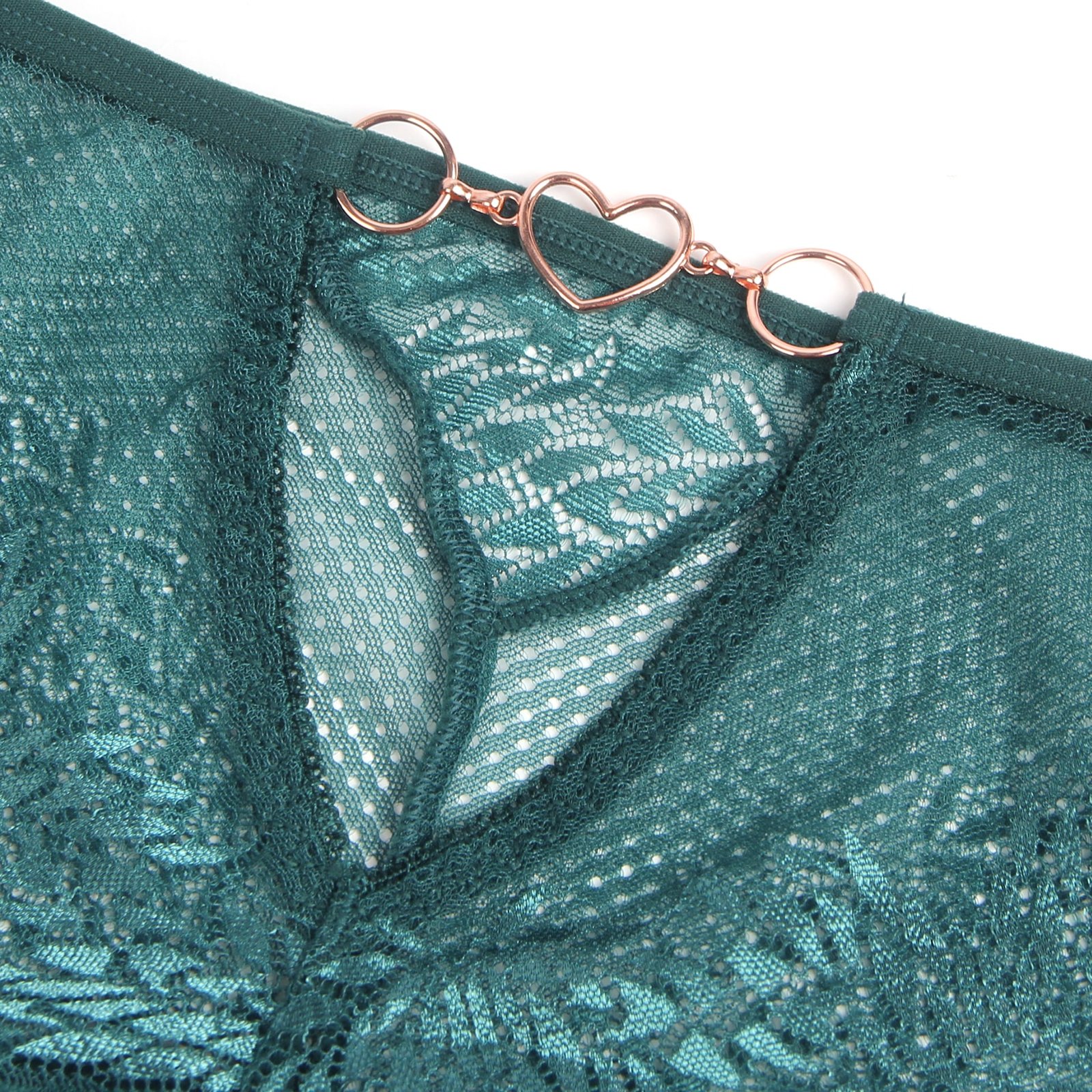 Advantages and selling points:1. Lace material, breathable and sexy;2. Hollow butt design, spliced heart-shaped metal decorative buckle, unique and fashionable;3. Equipped with cotton lining, comfortable to wear, breathable and sweat-absorbing.Standard product name: Available in black, red, and green colors; lace, hollow butt design, spliced heart-shaped metal decorative buckle, cotton lining; sizes M-3XL; ladies` sexy lace underwear.Main keywords: lace, hollow, heart-shaped decorative buckle, cotton lining.
