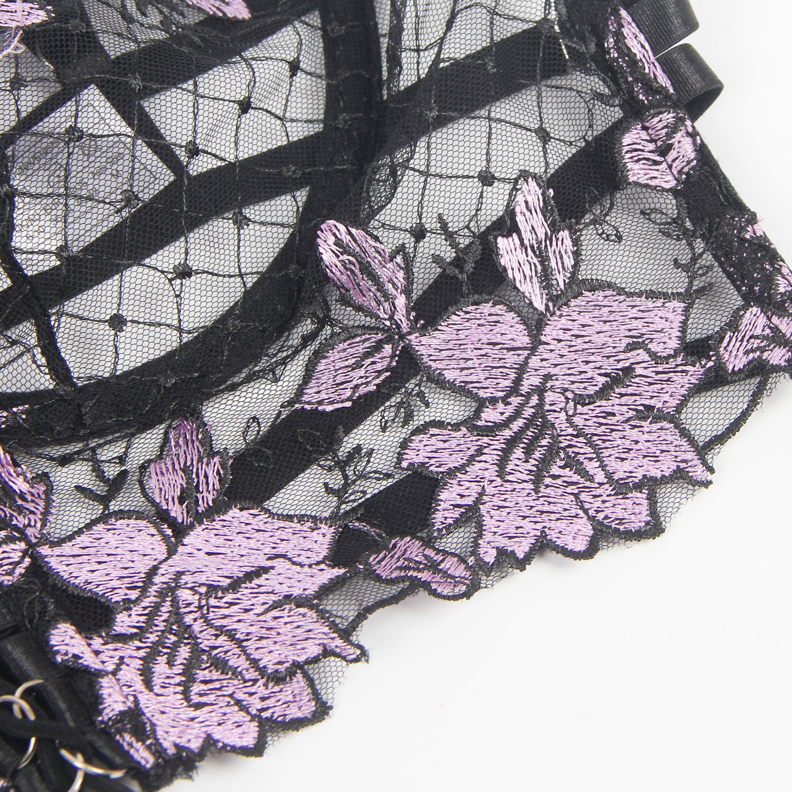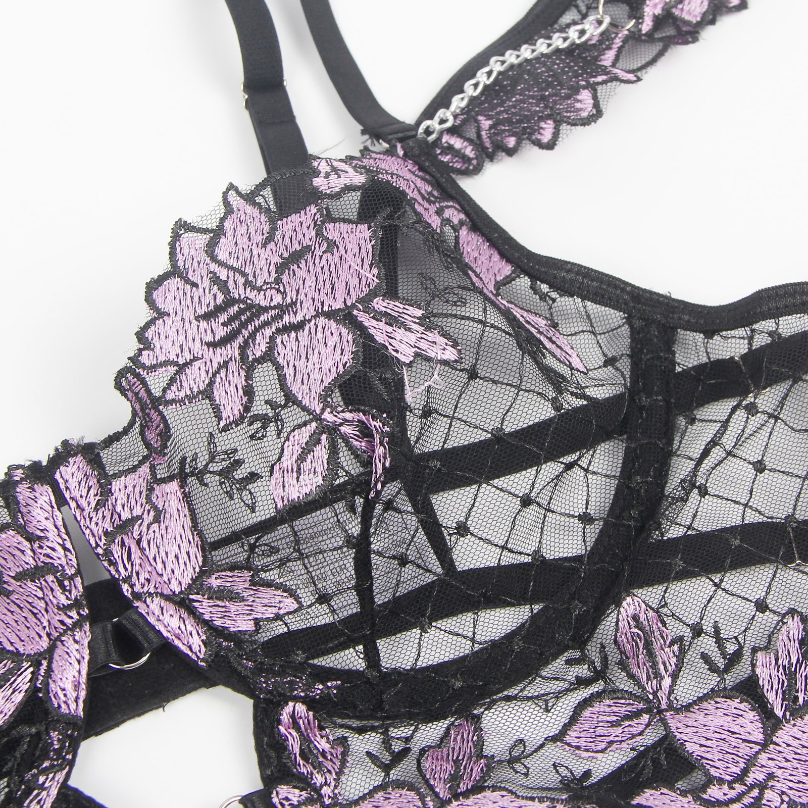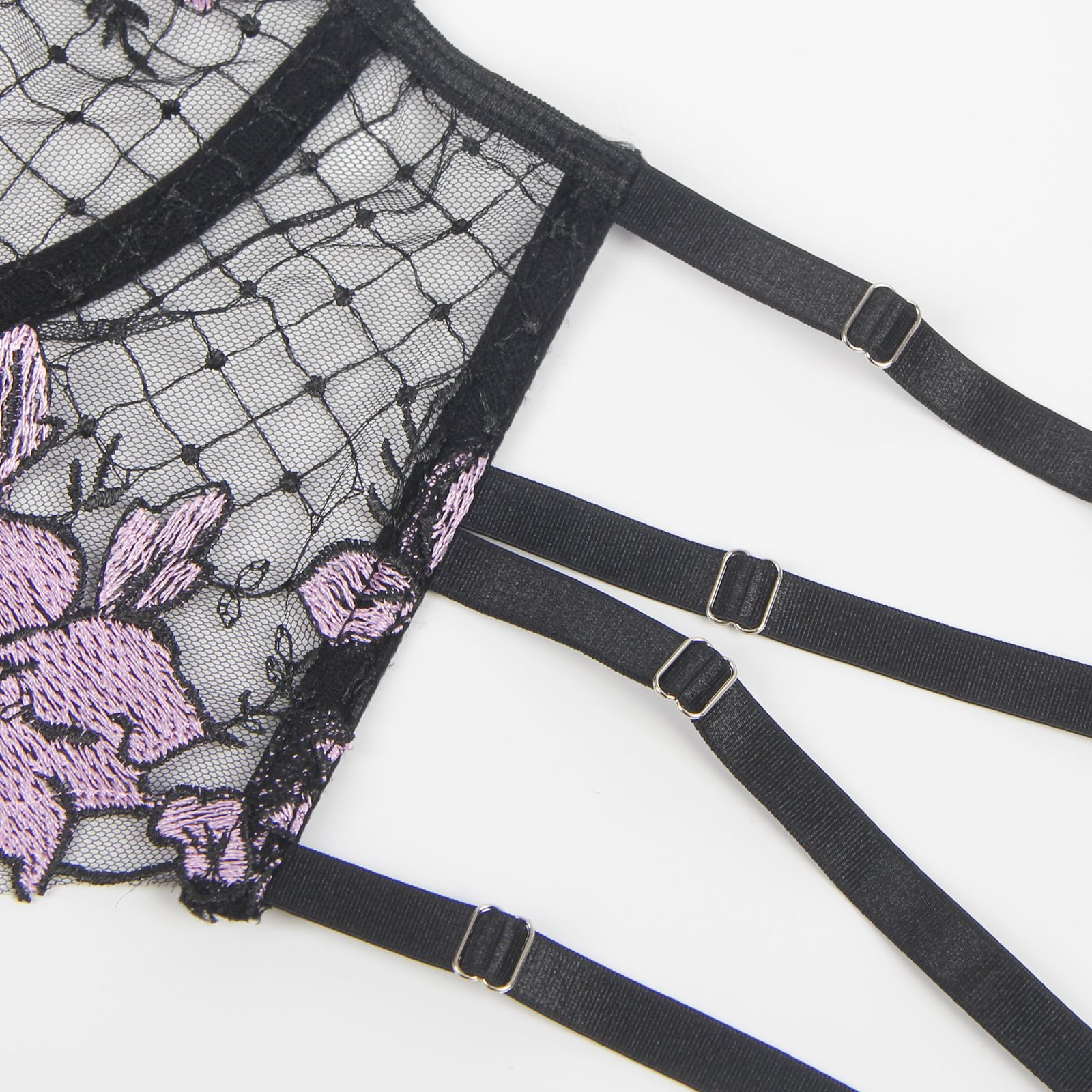 Advantages and Selling Points:1. Mesh splicing with three-dimensional embroidery, exquisite and high-end; 2. Underwire at the bust, back hook-and-eye design, adjustable bust size;3. Adjustable waist design for the underwear and garter straps;4. Mesh ruffle edges on both sides of the garter straps, sweet and playful;5. Double shoulder strap design, uniquely individual.Standard Product Name: Purple, three-dimensional embroidery, underwire at the bust, back hook-and-eye, adjustable waist for underwear and garter straps, adjustable bust and waist size, mesh ruffle edges on both sides of garter straps, double shoulder strap design, M-5XL, sexy garter lingerie set.Main Keywords: Underwire, three-dimensional embroidery, hook-and-eye, adjustable elasticity, mesh ruffle edges, double shoulder straps.