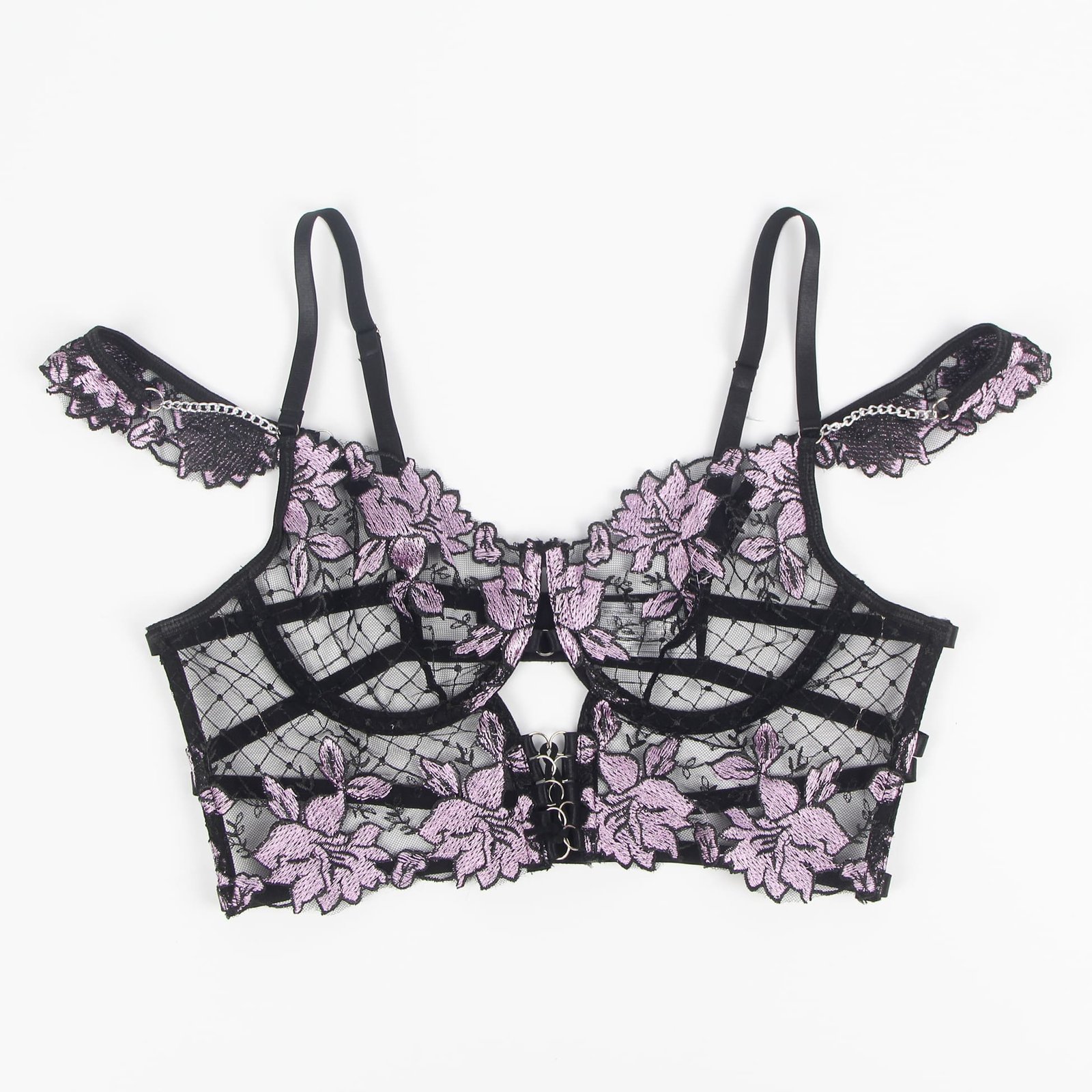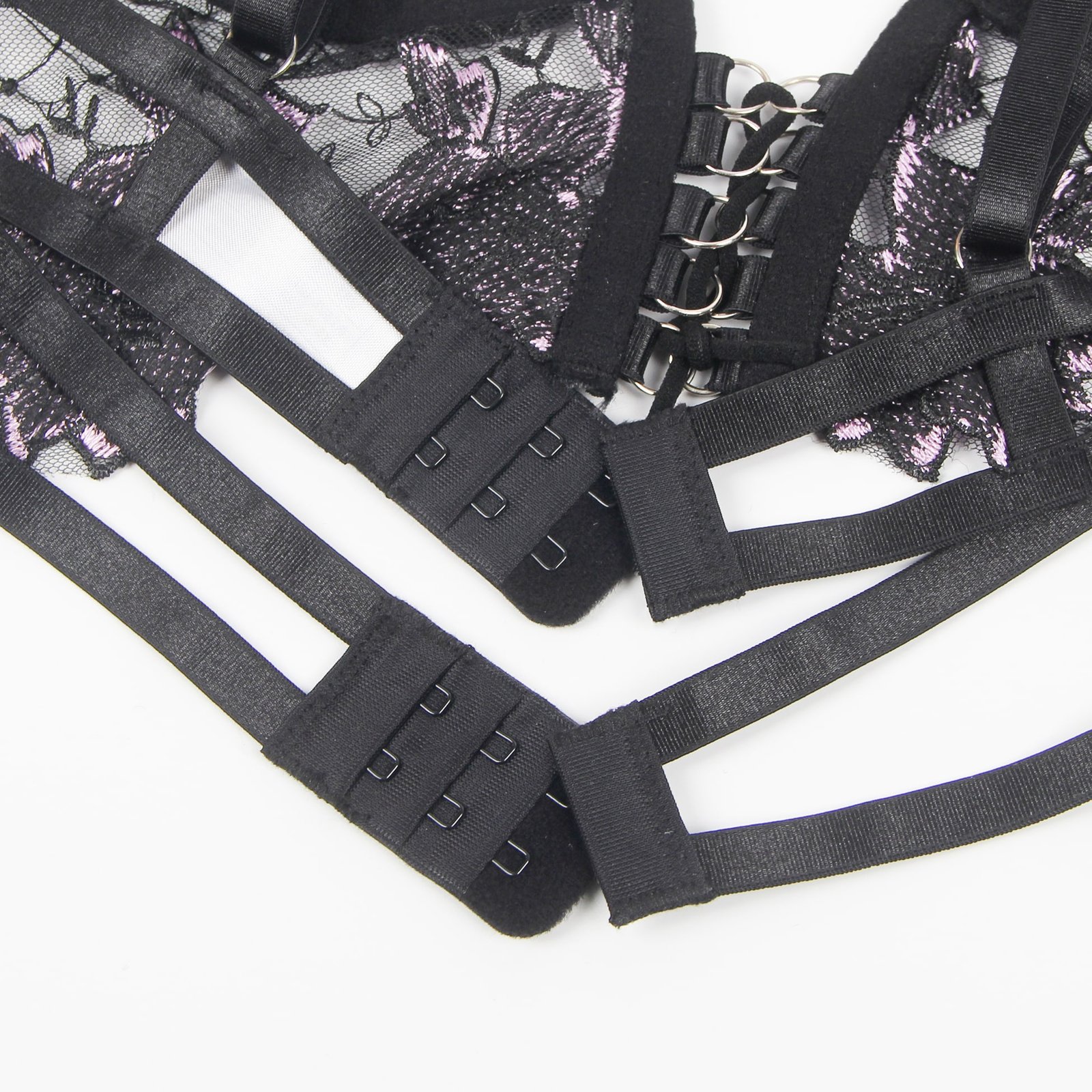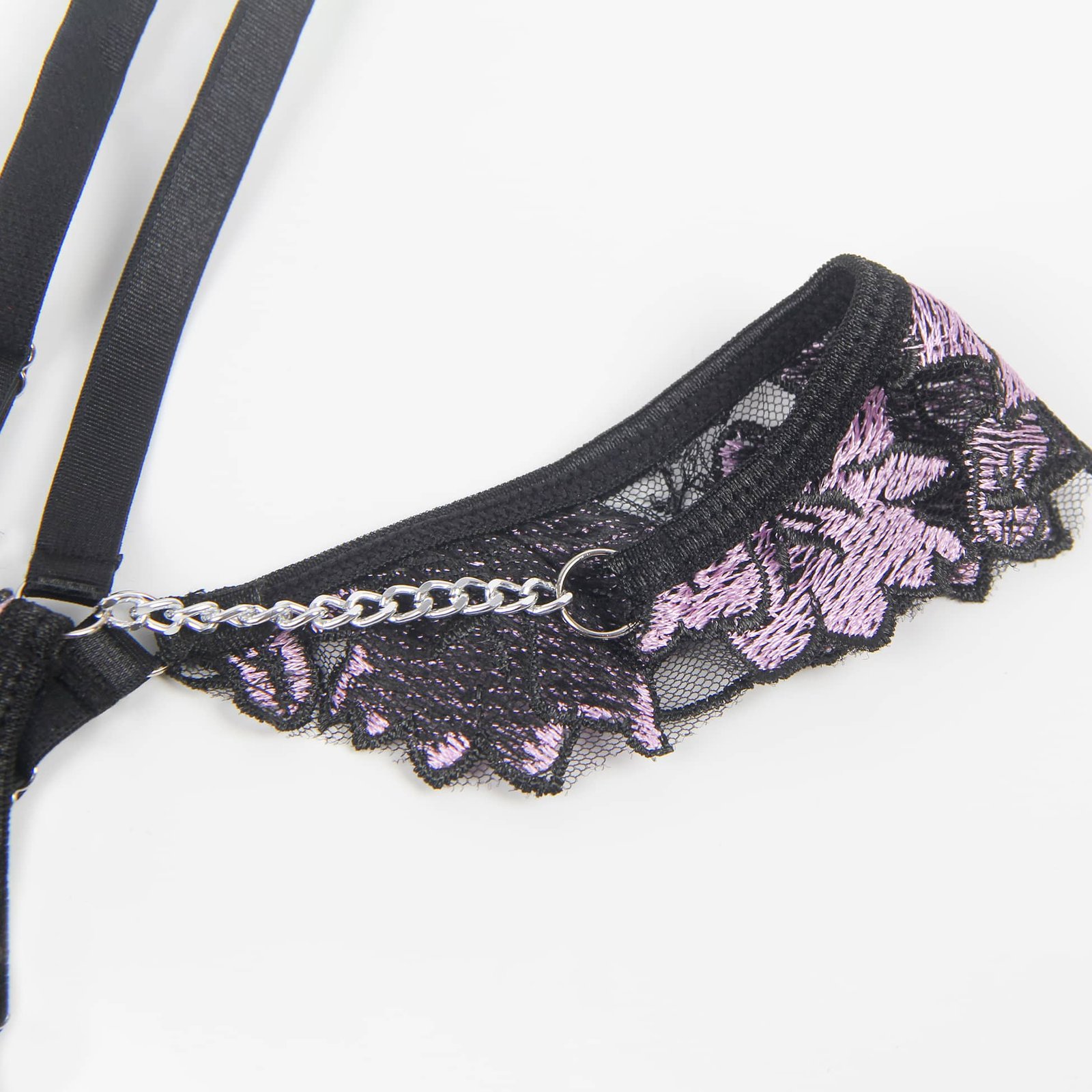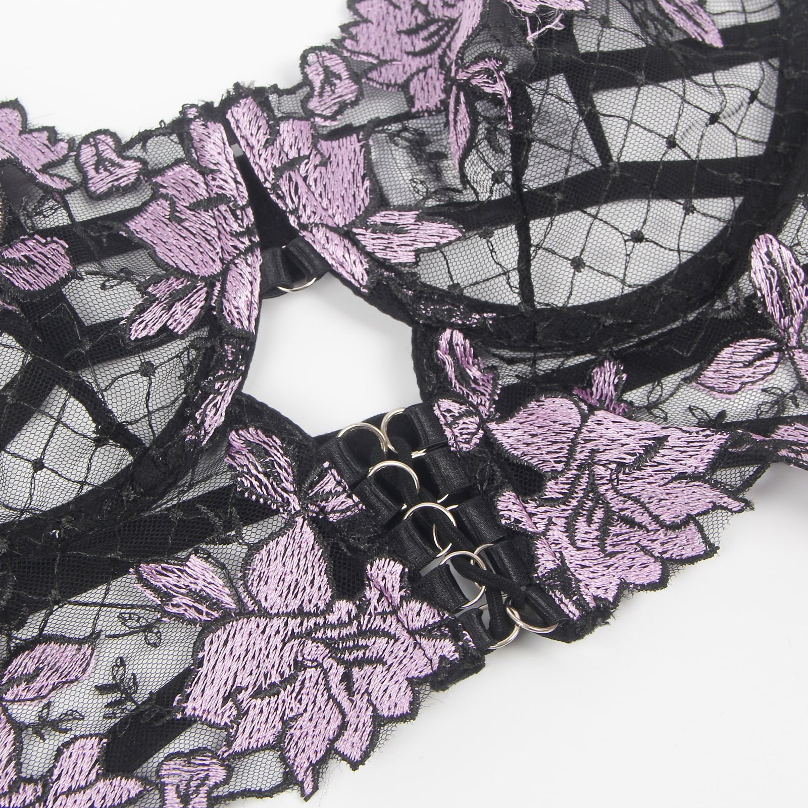 Advantages and Selling Points:1. Mesh splicing with three-dimensional embroidery, exquisite and high-end; 2. Underwire at the bust, back hook-and-eye design, adjustable bust size;3. Adjustable waist design for the underwear and garter straps;4. Mesh ruffle edges on both sides of the garter straps, sweet and playful;5. Double shoulder strap design, uniquely individual.Standard Product Name: Purple, three-dimensional embroidery, underwire at the bust, back hook-and-eye, adjustable waist for underwear and garter straps, adjustable bust and waist size, mesh ruffle edges on both sides of garter straps, double shoulder strap design, M-5XL, sexy garter lingerie set.Main Keywords: Underwire, three-dimensional embroidery, hook-and-eye, adjustable elasticity, mesh ruffle edges, double shoulder straps.