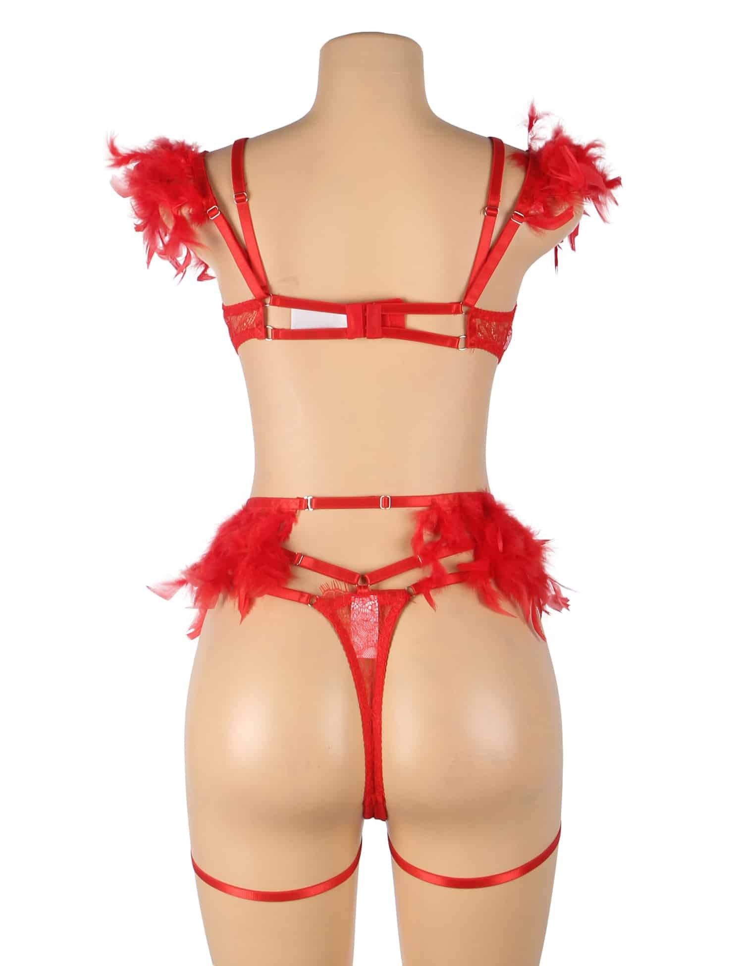 Advantages and Selling Points:1. Underwire at the bust, back hook-and-eye design, adjustable bust size;2. Eyelash lace at the bust and panties, chain at the cup edge and waist of panties, high-end and unique;3. Feather detailing on both sides of the waist cincher and outer shoulder straps, exquisite and beautiful;4. The waist cincher features a 9-shaped buckle design at the back for adjustable opening;5. Two detachable garter straps with removable leg rings, fashionable and individualStandard product name: Available in black, red, and pink, featuring eyelash lace, underwire at the bust, back hook-and-eye design, adjustable bust size, chain at the cup edge and waist of panties, feather detailing on both sides of the waist cincher and outer shoulder straps, 9-shaped buckle design at the back of the waist cincher for adjustable opening, two detachable garter straps with removable leg rings, adjustable shoulder straps, sizes M-5XL, sexy feather garter lingerie setMain keywords: eyelash lace, underwire, hook-and-eye, chain, feather, 9-shaped buckle, garter straps, leg rings