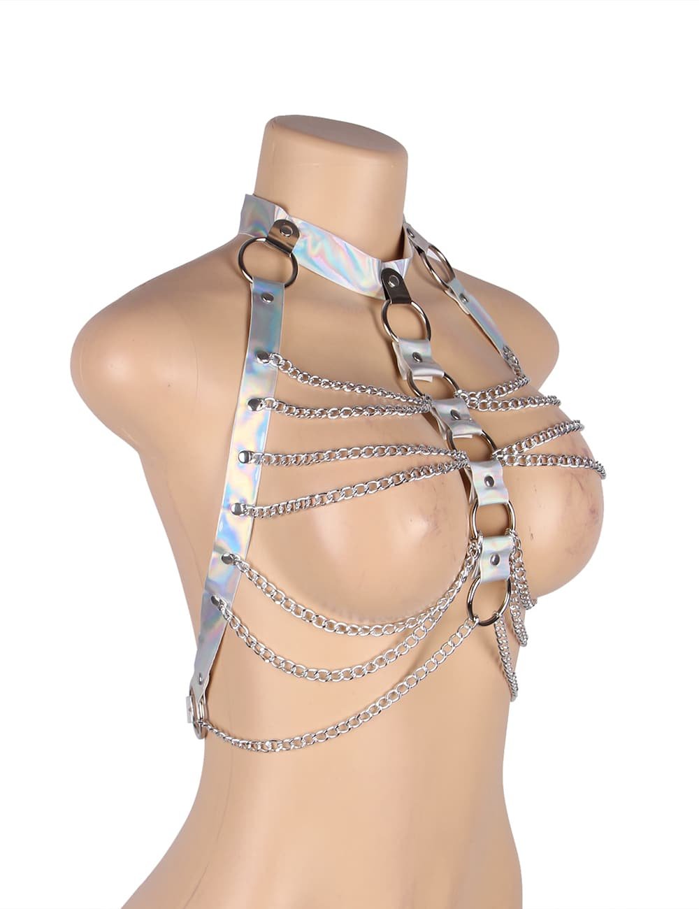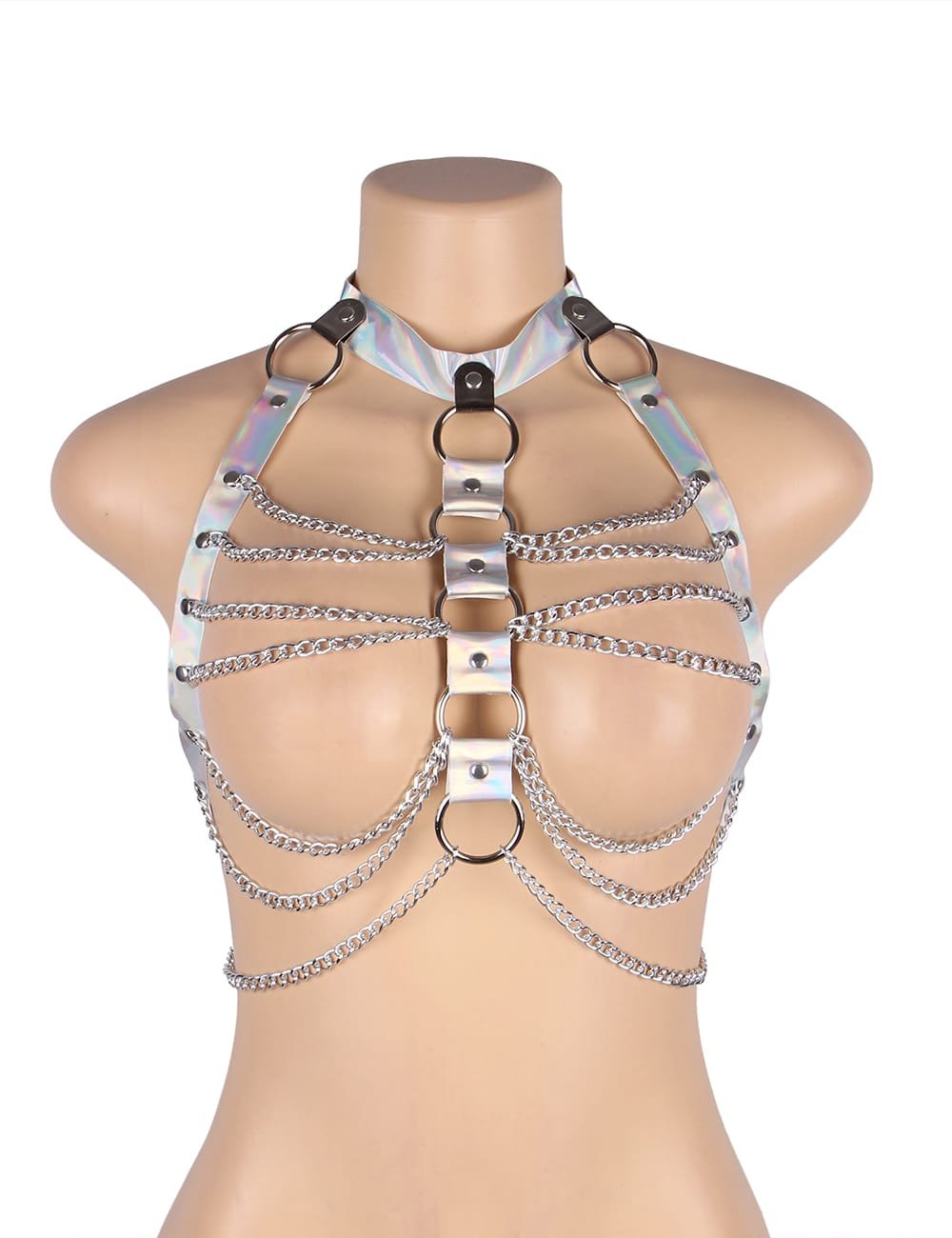 Introducing the latest product from ohyeah, the C81177 Bondage Gear. This product is a masterpiece of cutting-edge design, featuring a futuristic laser PU leather and punk rock-inspired aesthetic. Let?s take a look at the key selling points of this product:To start with, the laser PU leather material is both trendy and avant-garde, adding a high-tech touch to any bondage experience. It?s perfect for those who want to explore their kinky side in a futuristic way.Secondly, the front chest design boasts metal rings and rivets, along with several silver chain tassels, creating an edgy and alluring punk rock look. This is ideal for anyone looking to add a little extra excitement to their bondage play.In addition, the neck design includes multiple snap buttons for a customizable fit, making it comfortable and secure for all neck sizes. This feature is particularly important for those who want to experiment with different positions and scenarios.Finally, the adjustable metal buckle on the back of the product allows for a custom fit for the chest, catering to different body types and bondage scenarios.The C81177 is made of high-quality laser PU leather, featuring metal rings, rivets, and silver chain tassels, as well as a neck design with multiple snap buttons and an adjustable metal buckle on the back for chest adjustment. It?s perfect for anyone seeking a futuristic and edgy take on bondage play.Overall, the C81177 is an exceptional Bondage Gear product that adds a high-tech element and a punk rock aesthetic to your play. With its customizable fit, futuristic design, and top-quality materials, this product is a must-have for any bondage enthusiast seeking to spice things up in the bedroom. Why not add a little excitement to your next bondage session with the C81177? It?s the perfect Sexy Toy for those seeking something new and exciting.