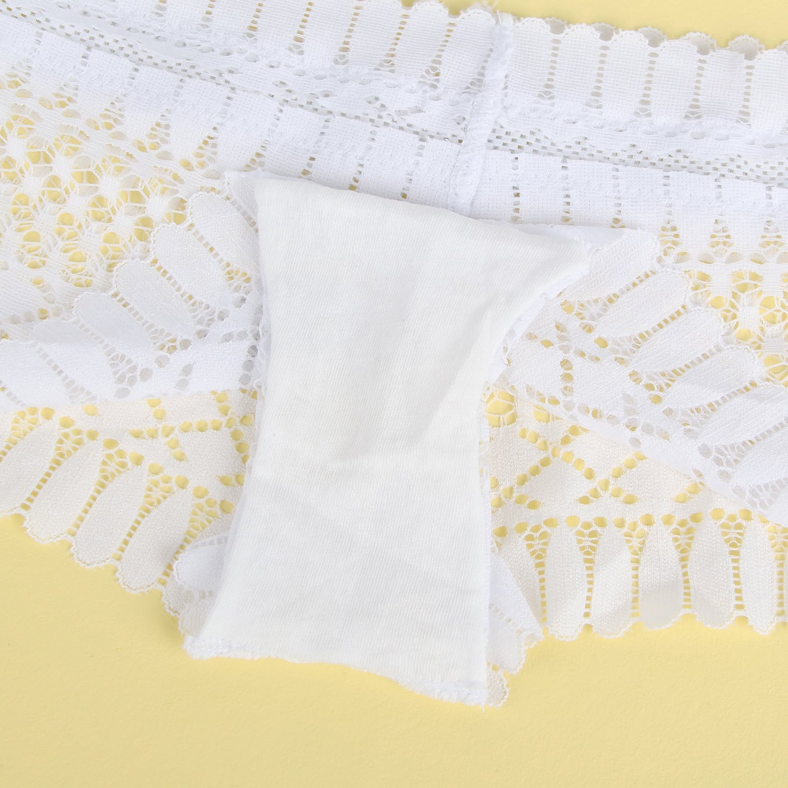 Advantages and Selling Points:1. Feather-shaped nylon lace, beautiful and exquisite;2. Equipped with cotton lining for comfortable wear, sweat-absorbing and breathable.Standard Product Name: Available in black and white, feather-shaped nylon lace, equipped with cotton lining, sizes M-5XL plus size, fashionable women`s underwear.Main Keywords: feather shape, nylon lace, cotton lining.
